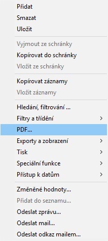 Vyvolá se nad libovolným formulářem stiskem pravého tlačítka myši. Obsahuje vybrané globální funkce, které lze volat průřezově c celém systému. Toto menu může být závislé na typu formuláře