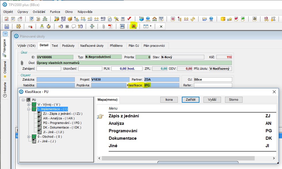 Pro plánované úkoly byla přidána možnost jejich klasifikace - volba Funkce > Zatřídit nebo double klik na pole Klasifikace. Tím se vyvolá druh klasifikace PU (plánované úkoly).